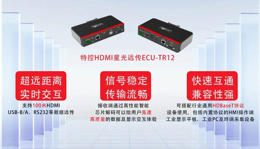 工業(yè)設(shè)備的迅速發(fā)展,隨著尺寸變大,主機(jī)與顯示器的距離隨之變長。設(shè)備功率也越來越大,隨之帶來的電磁干擾也是越來越強(qiáng)。在這種長距離強(qiáng)干擾的應(yīng)用環(huán)境,加上HDMI/DVI/VGA自身信號傳輸?shù)哪芰τ邢蓿退闶褂酶咭?guī)格線材也無法適用這樣的應(yīng)用環(huán)境。特控深研客戶現(xiàn)場需求,以解決客戶實際問題為目的,推出遠(yuǎn)距離傳輸控制解決方案。