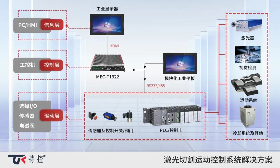 激光切割運(yùn)動控制系統(tǒng)解決方案以特控工控機(jī)MEC -T1922基礎(chǔ),結(jié)合激光器、冷卻系統(tǒng)控制系統(tǒng)等控制數(shù)字信號輸入輸出,從而生成控制指令完成復(fù)雜的加工,這種切割方式比傳統(tǒng)切割方式更高效、精度更好,也具備切割厚度上的優(yōu)勢,更能滿足工程機(jī)械行業(yè)厚板金屬高效率、高精度切割的需要,孕育著高功率激光切割機(jī)的廣闊市場。